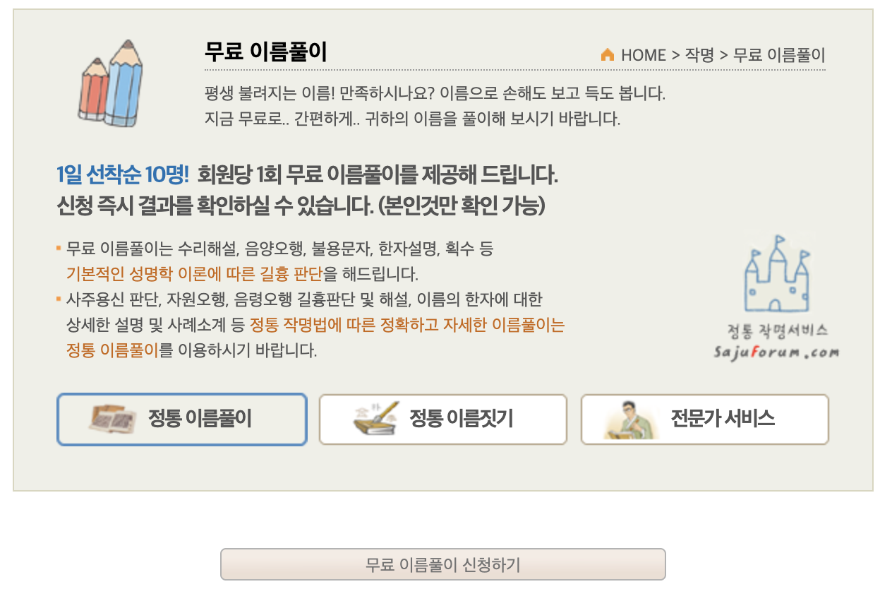 이름풀이 서비스: 하루 선착순 10명에게 무료 이름풀이 서비스를 제공하고 있습니다.