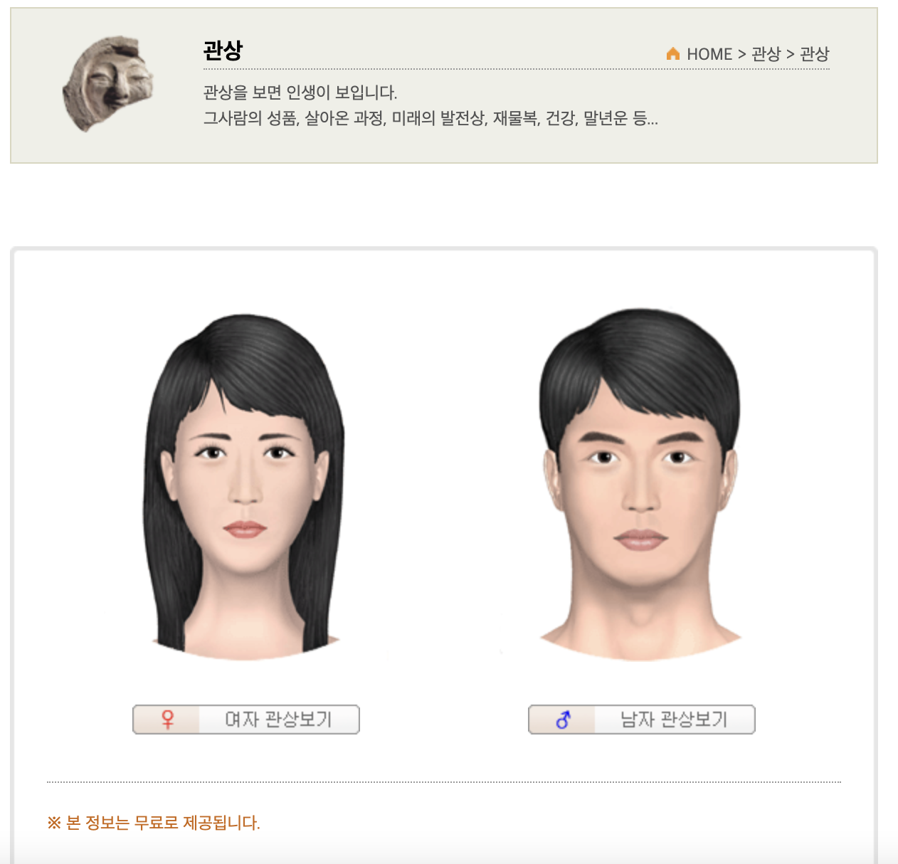 관상 서비스: 사주포럼에서는 관상을 무료로 서비스하고 있어요. 관상에 능한 사람은 정말 사람 얼굴만 보고 운명을 안다고하죠.