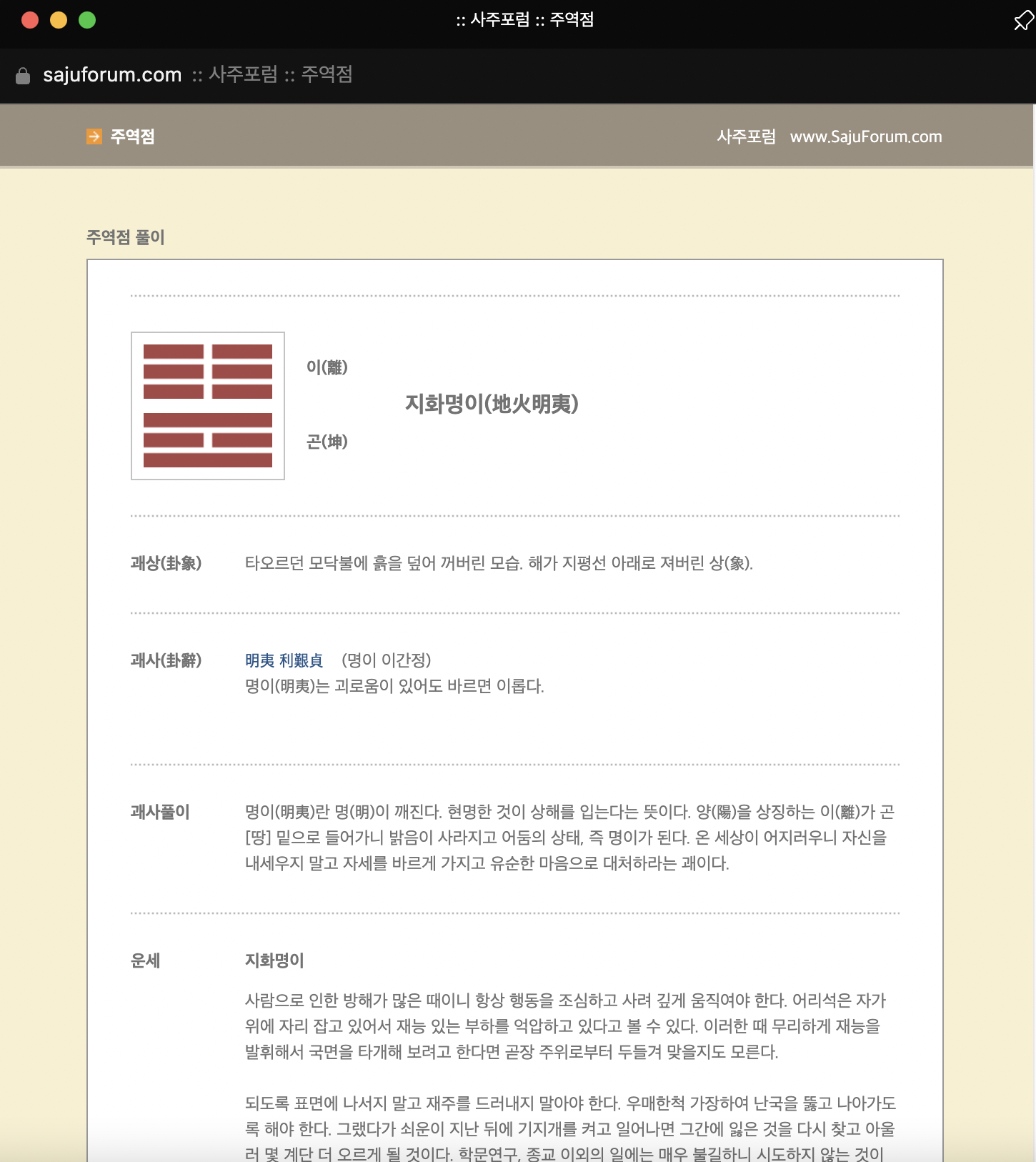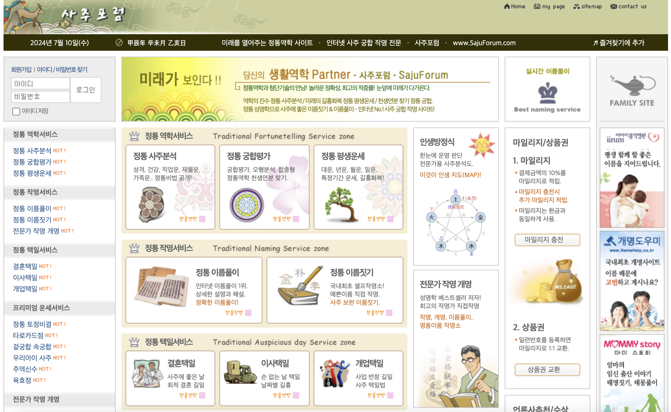 사주포럼은 사주팔자, 운세, 작명 등 다양한 역학 정보를 제공하는 전문 사이트입니다. 이 사이트는 사주에 대한 깊이 있는 이해를 도모하고, 사용자들이 서로 정보를 교류할 수 있는 공간을 마련해줍니다. 다양한 무료 서비스와 유료 서비스를 통해 사용자는 자신에게 맞는 정보를 선택하고 활용할 수 있습니다.