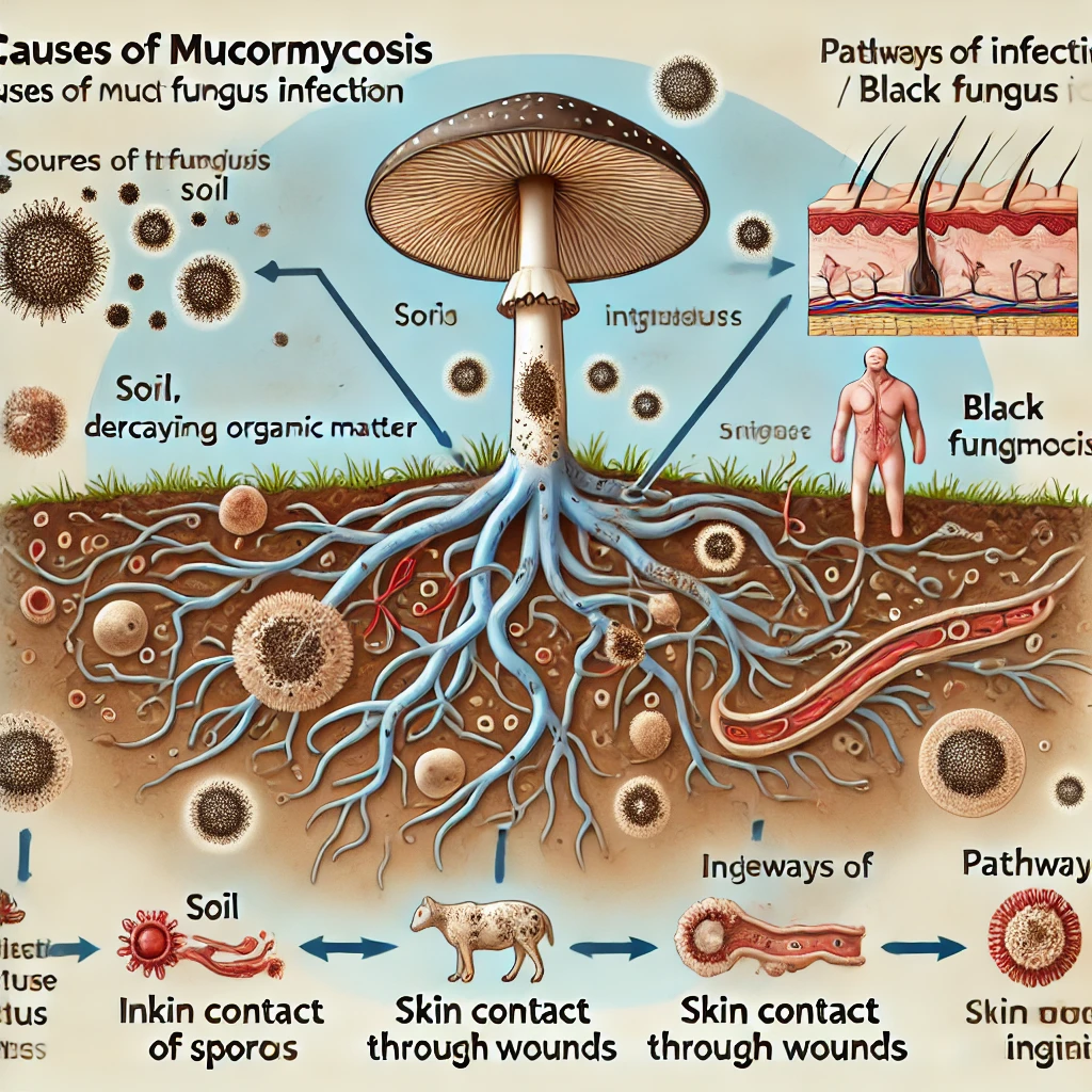 뮤코 마이코시스는 주로 라이조푸스(Rhizopus), 무코르(Mucor), 라이조무코르(Rhizomucor) 등의 진균에 의해 발생합니다. 이러한 진균은 토양, 부패한 유기물, 빵이나 과일 등에서 흔히 발견됩니다. 포자를 흡입하거나, 피부 상처를 통해 감염될 수 있으며, 드물게 오염된 음식을 섭취해 발생하기도 합니다.