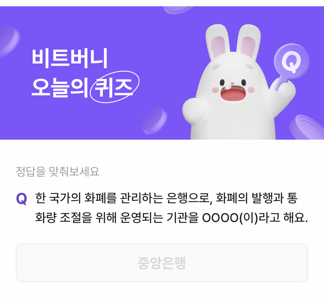 비트버니 오늘의 퀴즈 7월21일 정답 '한 국가의 화폐를 관리하는 은행으로, 화폐의 발행과 통화량 조절을 위해 운영되는 기관을 OOOO라고 해요'