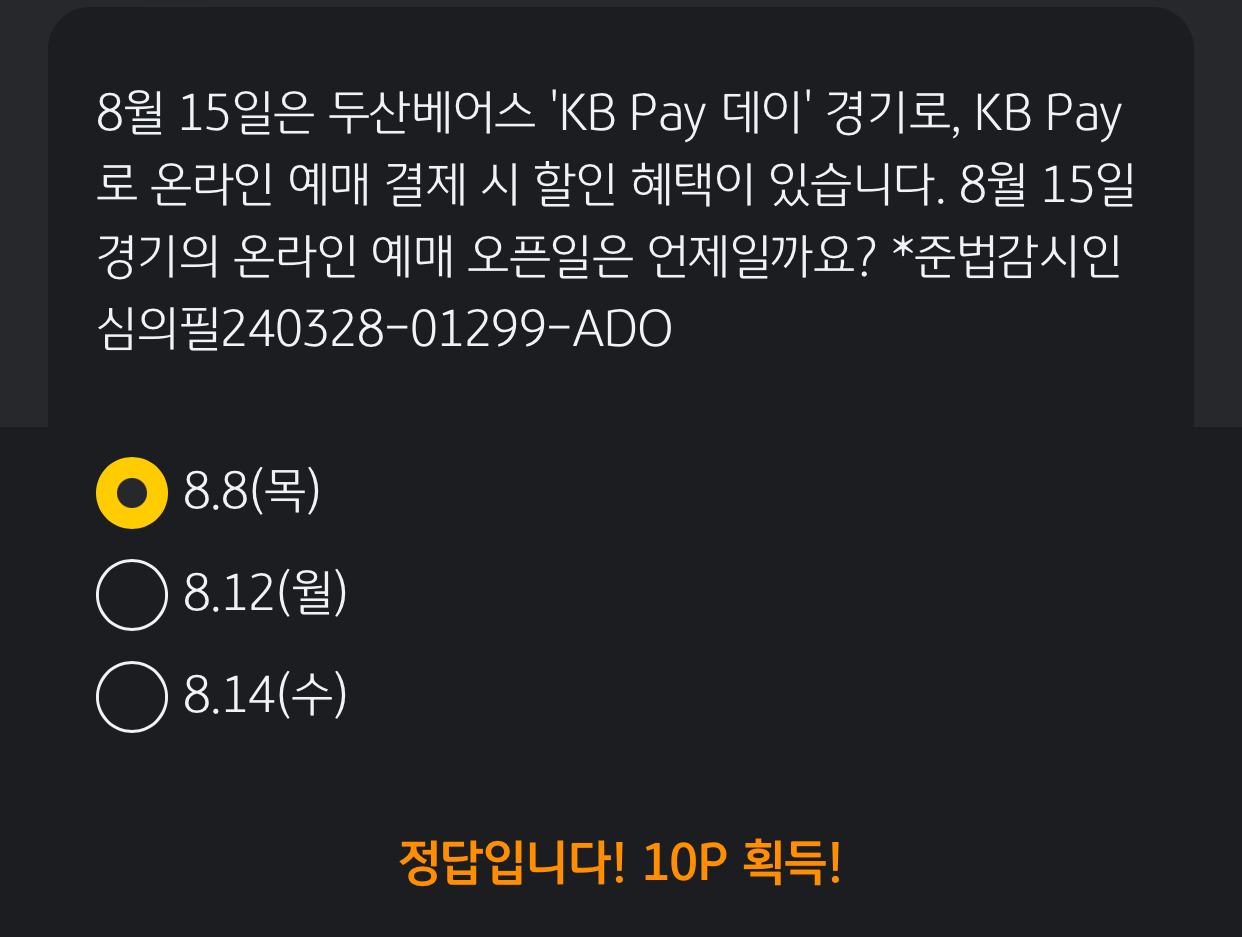 8월 15일은 두산베어스 'KB Pay 데이' 경기로, KB Pay로 온라인 예매 결제 시 할인 혜택이 있습니다. 8월 15일 경기의 온라인 예매 오픈일은 언제일까요?
