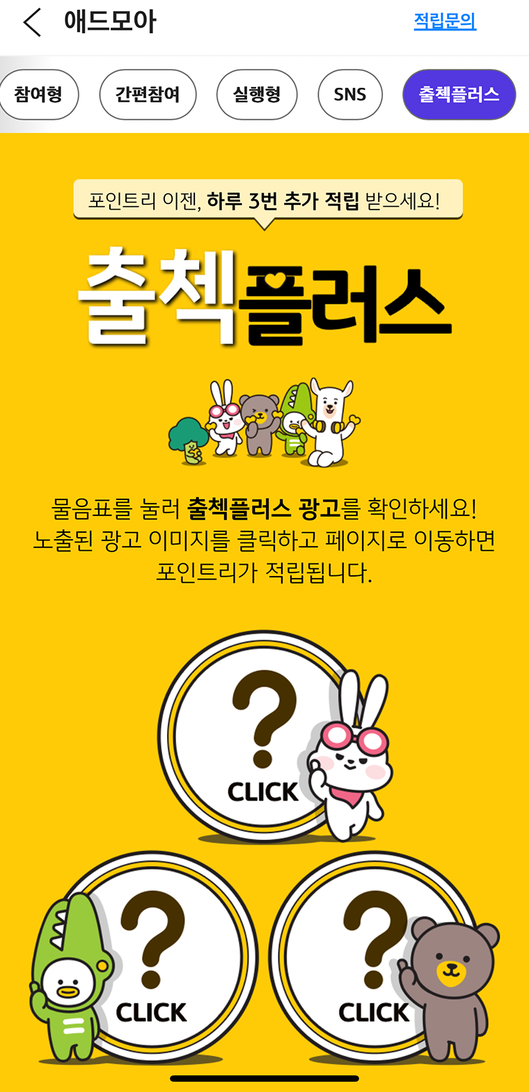 출첵플러스 메뉴로 들어가면 하루에 3번 추가로 포인트리를 적립받을 수 있답니다!